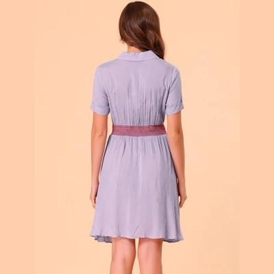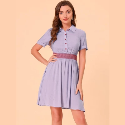 This shirt dress with short sleeves, a smocked waist and a point collar adds casual and vintage feel to your summer look. Regular fit. Style it with sandals or heels for a casual summer/spring look. Occasion: Shopping, Office, Coffee Shop, Daily, Date, Work, Weekend, etc. Black is a deep color, so please don’t wash it with light color, such as white, beige, pink, etc.