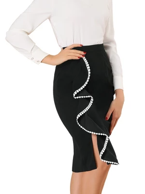 Designed with a split hem, the skirt from Allegra K is smart yet flattering. Falling just below the knee, the skirt is easily teamed with a tucked-in blouse and court shoes for a polished look. Upgrade your workwear collection with this skirt from Allegra K. Crafted from a soft fabric, the timeless fitcreates a form-flattering profile with feminine charm. This flattering skirt falls just below the knee for understated style and wears well with anything from fine knits to fitted blouses. Make a statement in the office with this elegantly fitted skirt from Allegra K. This piece hugs the body and finishes just below the knee to create a feminine silhouette. It features frill detailing at the side, adding to its elegant charm. Pair it with statement heels and a draping blouse to complete this polished look.