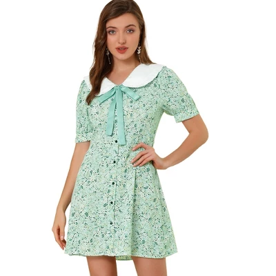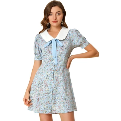 - Floral Print, Contrast Peter Pan Collar, Bow Tie Front, Puff Short Sleeve