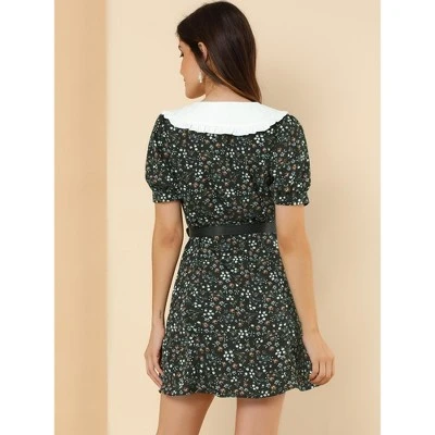 Get ready for a romantic night in the contrast collar short sleeve mini shirt dress. Chiffon woven fabric, covered in a lovely floral print, creates this cute summer dress and its collared V-neckline. A tying drawstring cinches the waist above a mini skirt, while a functional button placket runs down the front. This above-knee-length style with a flared skirt is fitted at the bust and waist. This sleek woven mini dress has a fresh floral print that covers a ruffle contrast collar and short bubble sleeves with a bow.