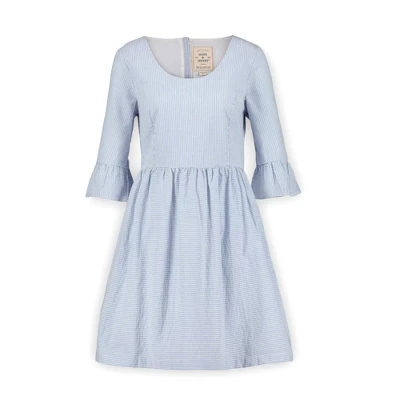 We took a few of our favorite things – organic cotton, flirty ruffles, and timeless seersucker – and combined them in our new fit and flare dress. Perfect for any occasion when you want to look pulled together and feminine. Hidden zipper down the center back. Let the compliments roll in!
