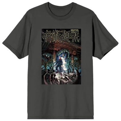 Celebrate your favorite anime character in style with this Jujutsu Kaisen Kaisen tee. The shirt features poster art of Yuji Itadori and Sukuna standing in front of a giant mouth while black and yellow kanji letters appear at the top of the poster. The tee comes in a charcoal short sleeve crew neck. Jujutsu Kaisen fans will love this comfy cotton tee.