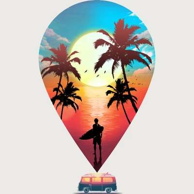 - Not shore what to wear? This beautiful design featuring the silhouette of a surfer on a palm tree filled beach facing a colorful ocean with birds, the sun, and clouds on the horizon on top of a surf van is perfect for the summer!