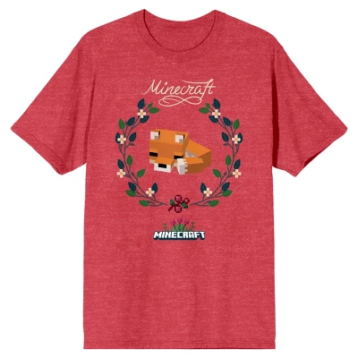 Celebrate your favorite video games with this Minecraft tee. The shirt features a sleeping fox from the game surrounded by a laurel wreath. White cursive letters above the image read, “Minecraft,” while the game’s logo appears at the bottom of the shirt. The tee comes in a red heather short sleeve crew neck. Show your love for the Minecraft games with this comfy t-shirt.
