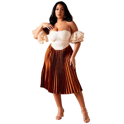 A pleated midi skirt with an A-line silhouette and a high waisted fit is the perfect addition to any wardrobe. With its elastic waistband, it will give you that extra bit of comfort while still making you look stylish and put together. Whether youÂ’re looking for something to wear on a night out or as part of a more casual outfit, this skirt will do the trick! So don’t be afraid to show off your fashionista side with this must-have item. You won’t regret it!